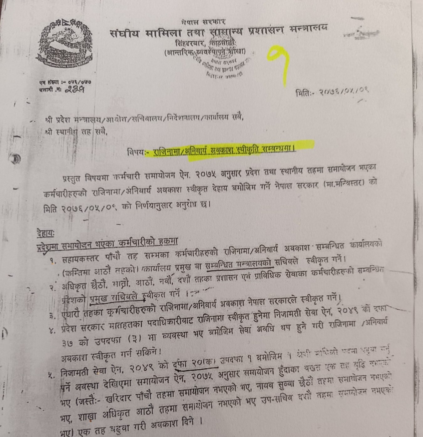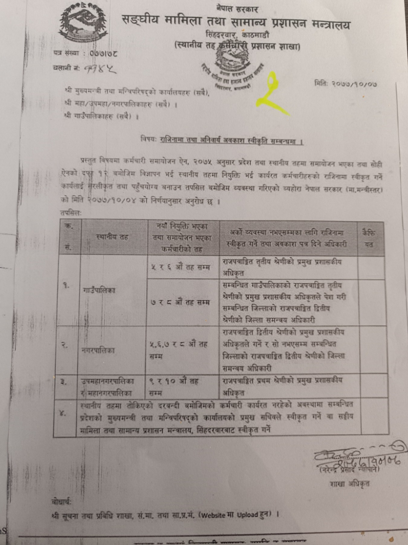 अनिवार्य अवकाश/राजिनामा स्वीकृति सम्बन्धमा परिपत्र(जानकारीको लागि)